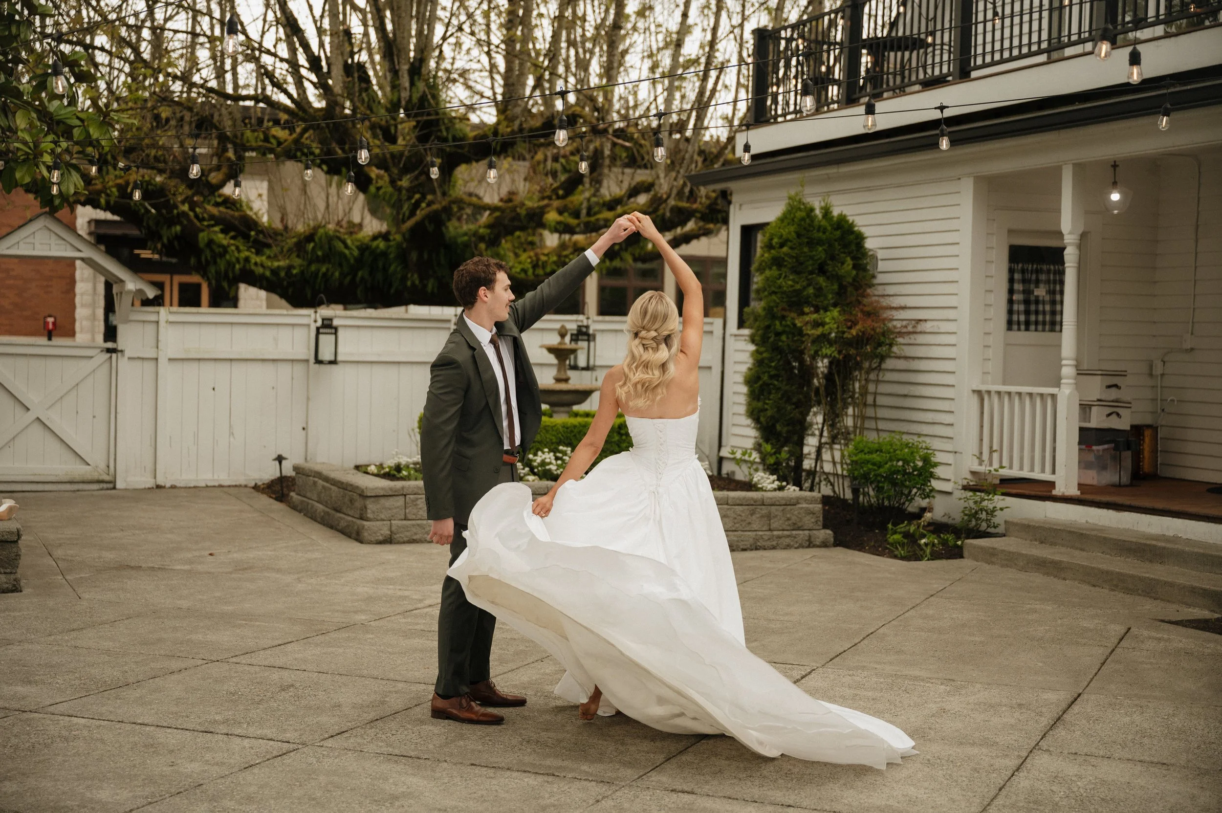 The spacious patio area is ideal for dancing under the string lights. The concrete tiled floor creates a natural dance floor. During this wedding photography shoot, the couple played croquet on the lawn, adding a whimsical element to their gallery. Every backdrop here is perfect for wedding photos, offering plenty of variety and romantic energy.