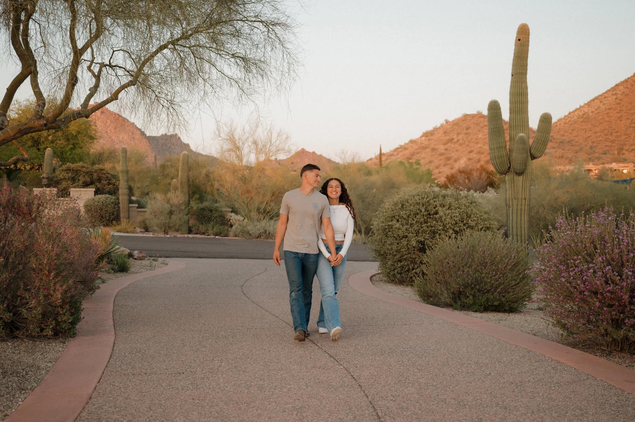 As soon as I arrived and drove along East Pinnacle Peak Road, I knew we had to shoot there. The sun was setting just beyond the hills, bathing the road in soft golden light. This location gave us everything we needed to capture the perfect shots! Altogether, the wide-open desert views, dynamic lines, and contrasting textures created the perfect setting for some fun and adventurous engagement photos.